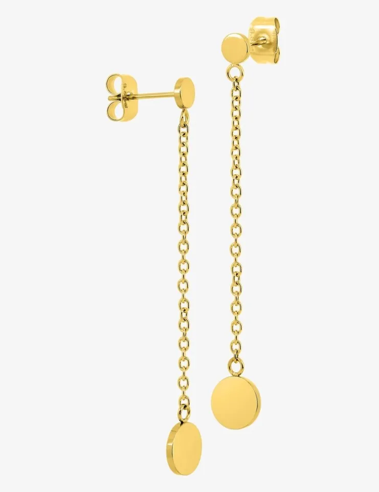 Boucles d’oreilles en acier doré pendantes avec chaine et jeton. Ces boucles d’oreilles élégantes de 52 mm de long.et d’un poids de 1,40 g.,ajouteront une touche de brillance à votre look. Le fermoir poussette assure un maintien sécurisé tout au long.de la journée.