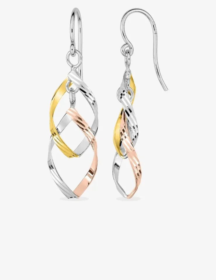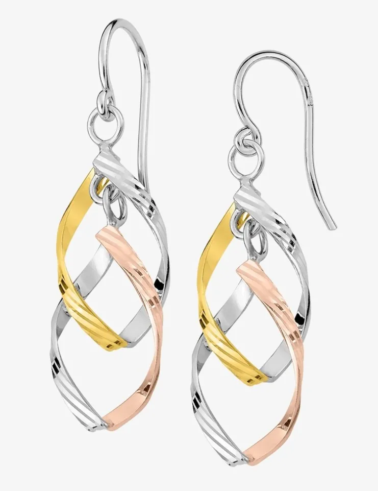 Boucles d’oreilles pendantes en argent 925 ‰. Cette paire de boucles d’oreilles est en forme de serpentins jaune, gris et rose qui s’entremêlent. La hauteur de cette paire de boucles d’oreilles est de 60 mm. Elles sont équipées d’un fermoir crochet. Son poids est de 3 g.Un modèle original.