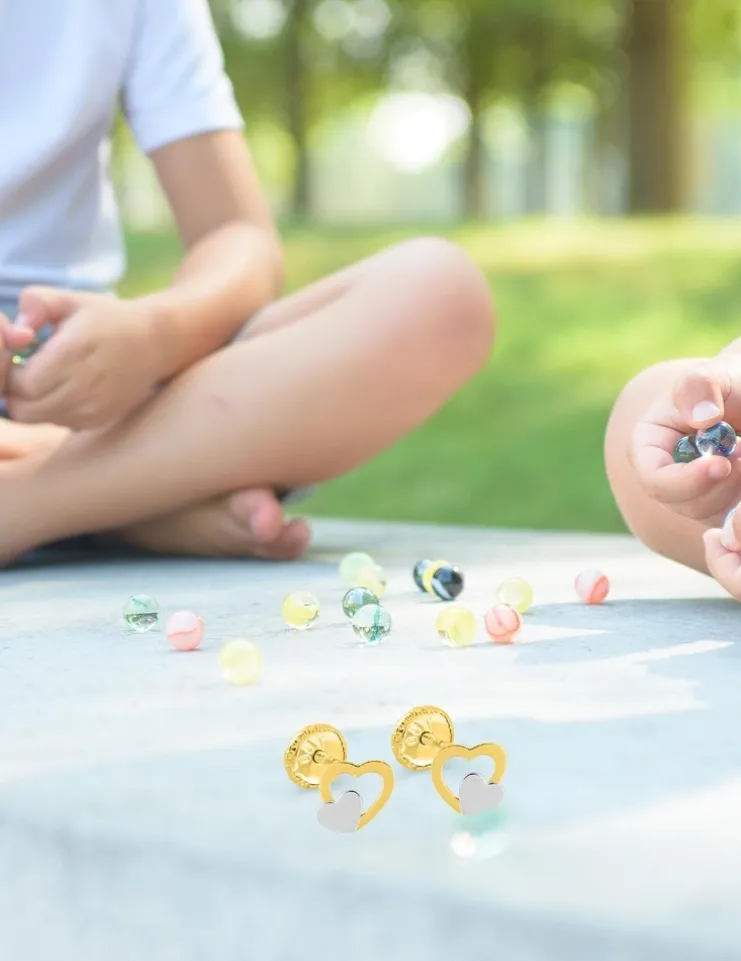 Boucles d’oreilles enfants, en or jaune 375‰ (9 carats), composé de 2 cœurs, un cœur ajouré jaune et un plus petit à l’intérieur sur lequel une fine couche de rhodiage a été apposée pour lui donné la couleur de l’or blanc. Ces boucles d’oreilles ont un poids moyen d’or de 0,25 g et un système de fermeture avec « poussettes vis ».Des boucles d’oreilles originales avec son duo de cœur et de couleur feront la joie de toutes les petites filles.
