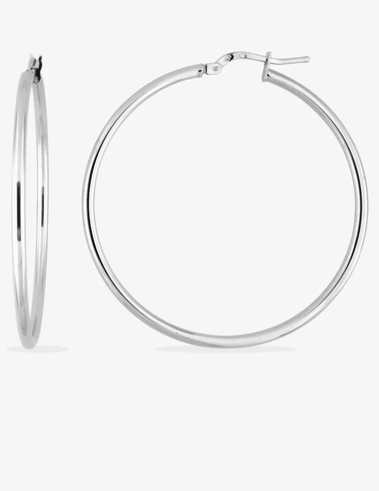 Boucles d’oreilles créoles lisses de 40 mm de diamètre, en or blanc 375‰ (9 carats) composées d’un fil d’or creux de 2 mm. Ces boucles d’oreilles ont un poids moyen d’or de 2 g et un système de fermeture avec charnières.Des créoles ultra-féminines et indémodables.