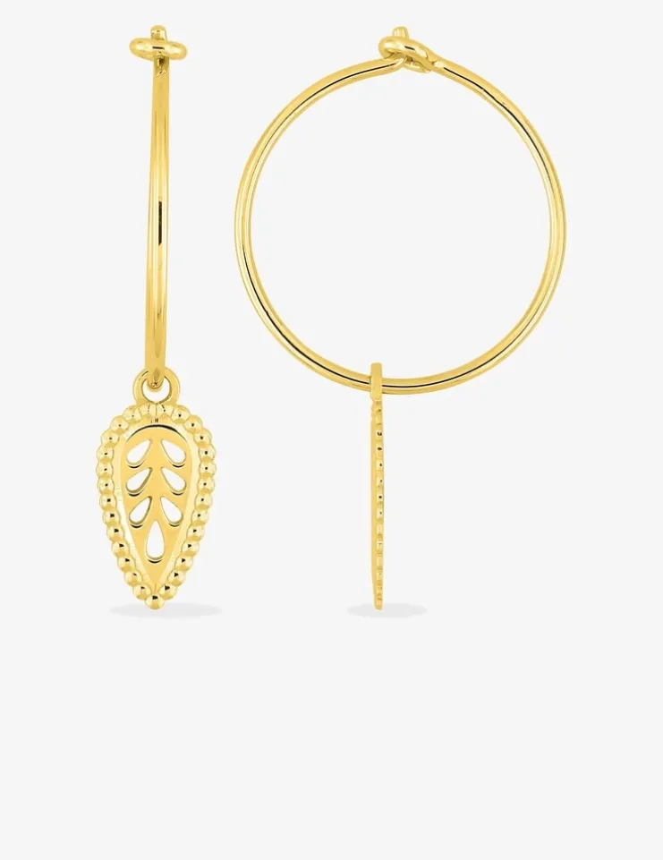 Un joli modèle de boucles d’oreilles en plaqué or qui se compose d’une fine créole avec un motif pendant amovible esprit feuille. Elles se ferment par un crochet et la créole à un diamètre de 15 mm. Des créoles à porter au quotidien avec ou sans le motif.