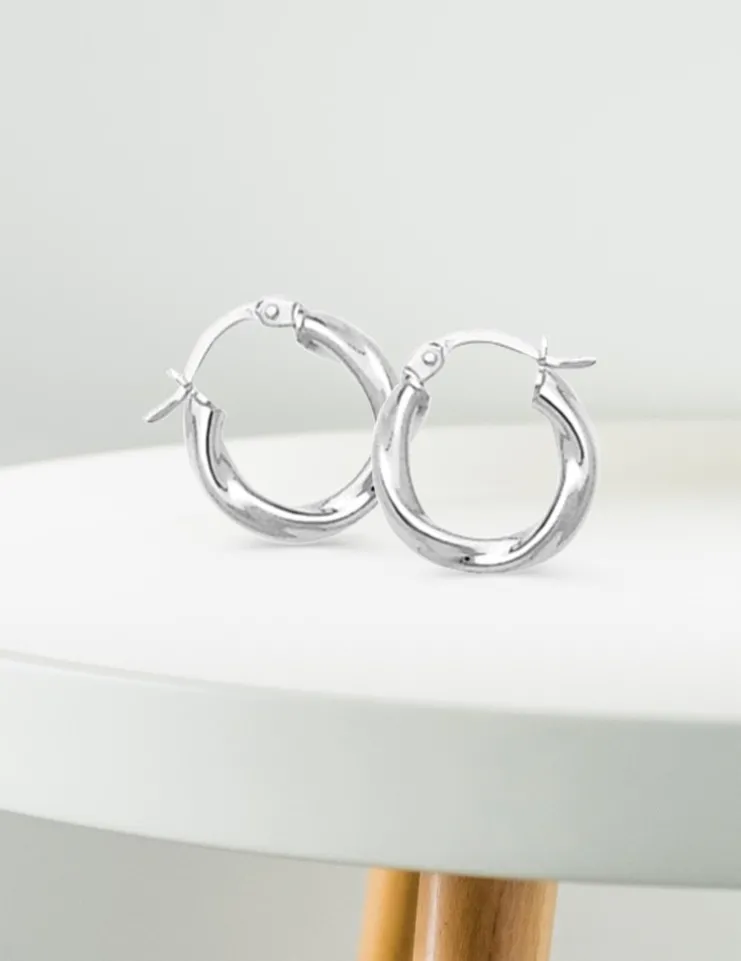 Boucles d’oreilles créoles en or blanc 750 ‰ (18 carats). Créoles torsadées, fil de 3 mm et diamètre 10 mm. Le poids d’or théorique est de 1,25 g.