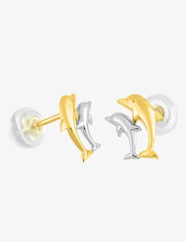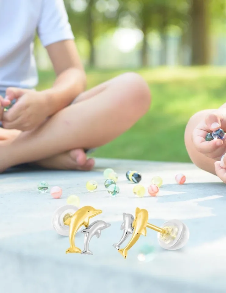 Boucles d’oreilles enfants en or jaune 375‰ (9 carats) composé d’un grand dauphin jaune et d’un plus petit sur lequel une fine couche de rhodiage a été apposée pour lui donner la couleur de l’or blanc. Ces boucles d’oreilles ont un poids moyen d’or de 0,25 g et un système de fermeture avec « poussettes silicone » pour une meilleure prise en main.Des boucles d’oreilles bicolores dauphins, un cadeau idéal à offrir à une petite fille.