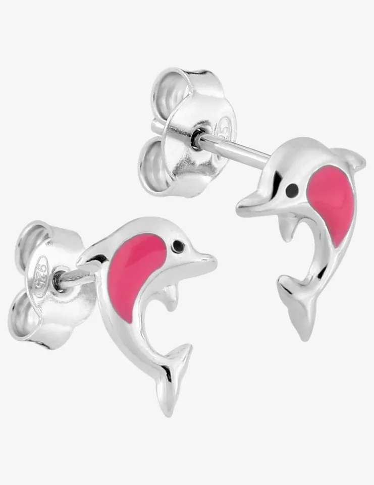 Boucles d’oreilles en forme de dauphins avec de la laque rose pour enfant en argent 925 ‰. Sa hauteur est de 8 mm et son poids est de 0,50 g. Elles sont équipées d’un fermoir poussette.Un modèle discret et coloré.