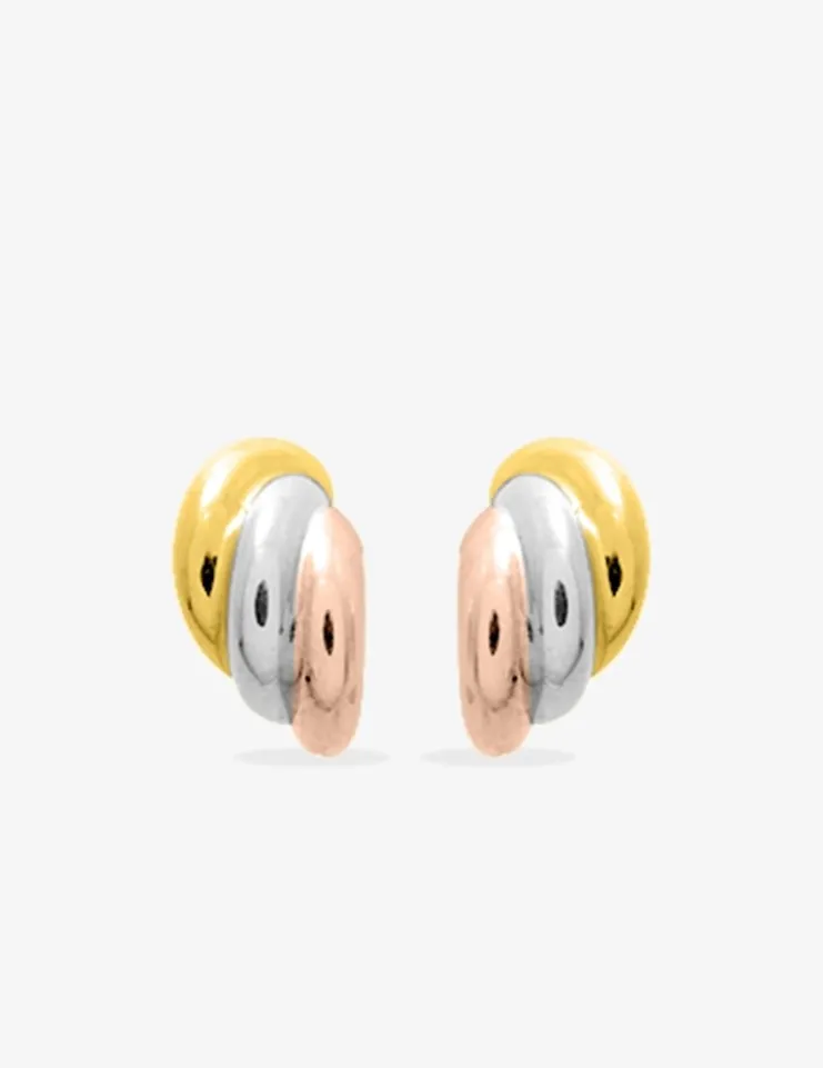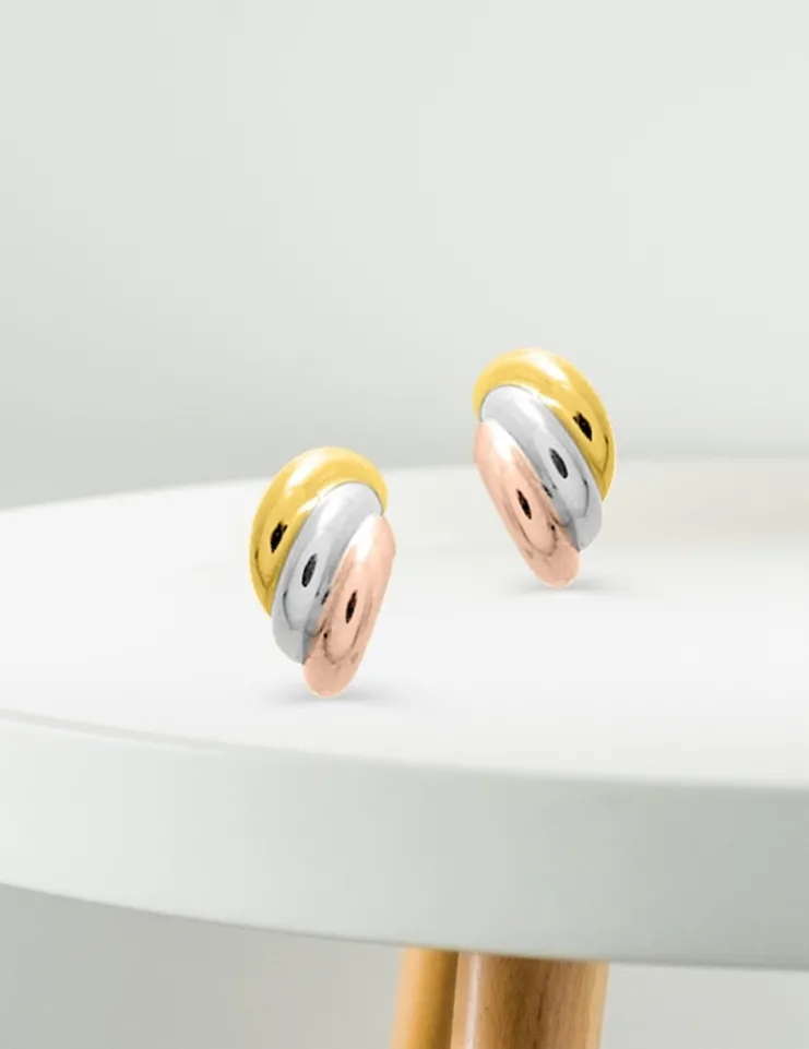 Boucles d’oreilles demi-créoles 3 ors 750 ‰ (18 carats). À l’esprit de coquillages, elles se composent en trois parties accolées or jaune, blanc et rose. Le poids théorique d’or est de 1, 60 g et le fermoir poussette belge.