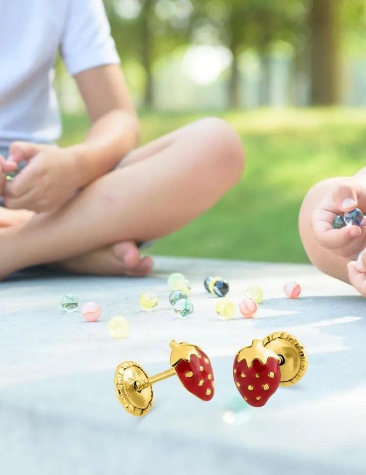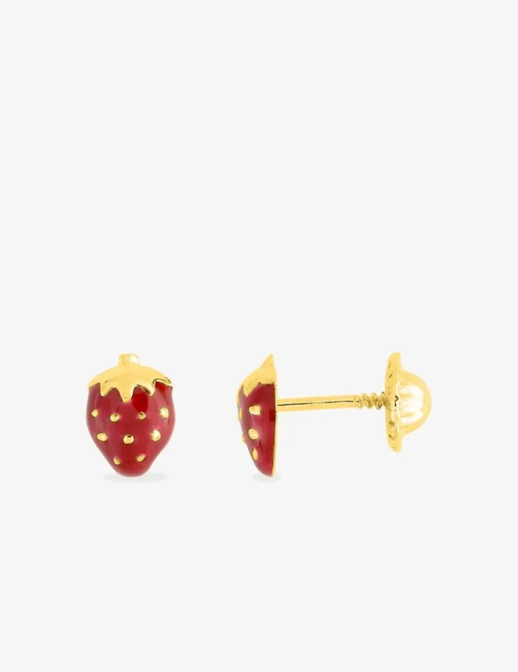 Boucles d’oreilles enfants, motif fraise, en or jaune 375‰ (9 carats) et laque rouge. Ces boucles d’oreilles ont un poids moyen d’or de 0,25 g et un système de fermeture avec « poussettes vis ».Des boucles d’oreilles aux délicieux motifs fraise à offrir a toutes les petites filles.