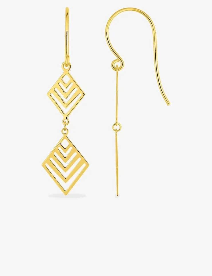 Ces boucles d’oreilles en or jaune 375‰ (9 carats) se composent d’un fermoir crochet et de deux losanges ajourés. Elles mesurent 40 mm de hauteur pour un poids d’or de 0,90 g. Un design géométrique à la pointe de la tendance.