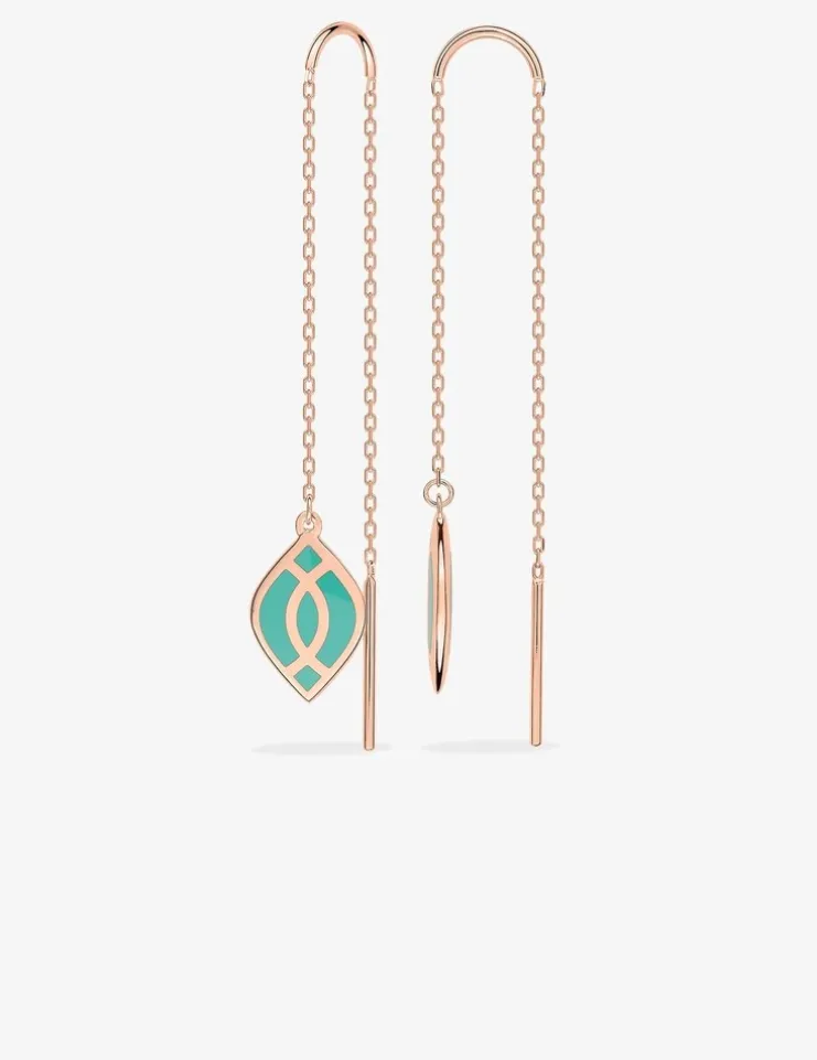 Boucles d’oreilles pendantes » Lore » en or rose 375‰ et laque de couleur verte aqua de la collection Ondine. Une fine chaine rehaussée par un motif Infini stylisé symbolisant l’amour éternel, la tendresse et la féminité.Le poids d’or moyen de ces boucles d’oreilles est de 0,95 g.