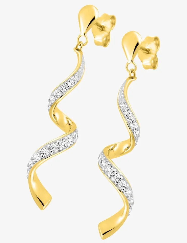 Boucles d’oreilles pendantes en or jaune 375 ‰ (9 carats) longues et torsadées elles ont une face recouverte d’une couche de rhodium et sertie d’oxydes de zirconium. Le fermoir est de type poussette belge et le poids d’or moyen est de 1,45 g.