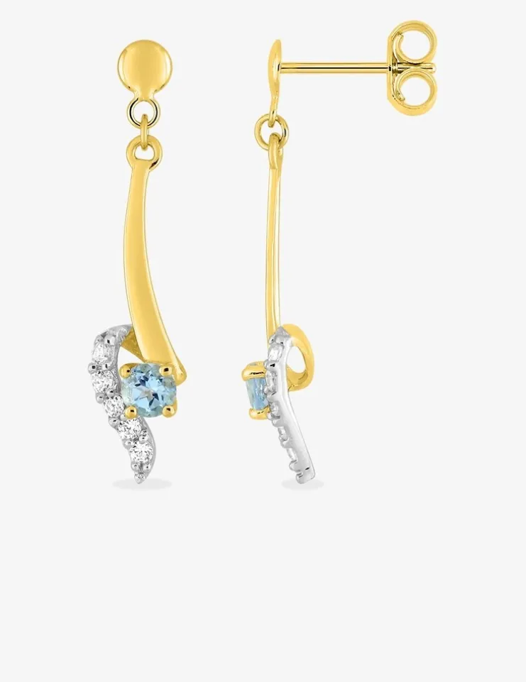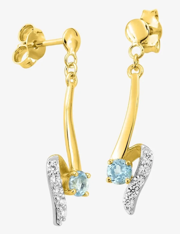 Boucles d'oreilles pendantes or jaune 375 ‰, rhodium, topaze bleue traitée et oxyde de zirconium SO OR
