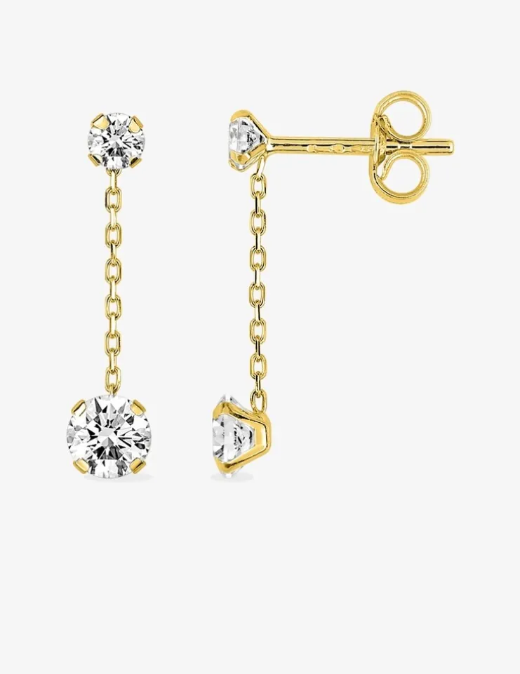 Boucles d’oreilles pendantes or jaune 750 ‰ (18 carats), elles possèdent deux oxydes de zirconium rond de diamètre 3 et 4 mm sertis griffes qui sont séparés par une fine chaîne forçat. Le fermoir est de type poussette belge, le poids théorique d’or de 0,50 g. Avec un look tout en finesse et la brillance des oxydes, vous pourrez les porter chaque jours.