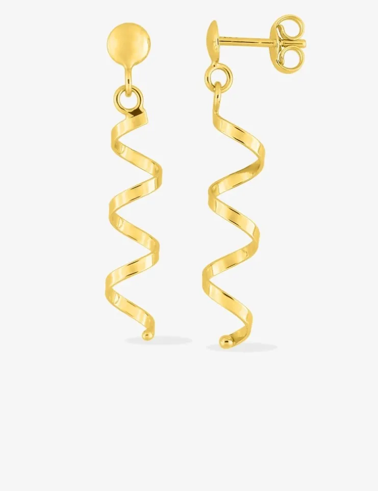 Boucles d’oreilles pendantes or jaune 375‰ (9 carats) composées d’un fil en forme de serpentin. Ces boucles d’oreilles ont un poids moyen d’or de 0,80 g et un système de fermeture avec « poussettes belges ».Des boucles d’oreilles originales qui apportent une touche de peps à toutes vos tenues.