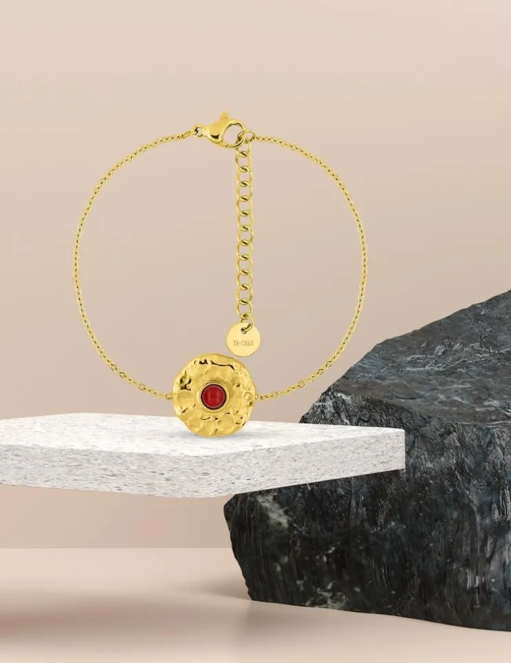 Bracelet en acier inoxydable de la collection APA. Ce bracelet en acier doré se compose d’une chaine forçat et d’un motif pastille finition martelée avec au centre un rubis synthétique. Longueur 19 cm ajustable. Fermoir mousqueton.La collection acier APA s’adresse aux hommes et aux femmes. Ses bijoux en acier inoxydable ont un style original, fantaisie et coloré, vous pourrez pour certains les associer en parure. Vous trouverez forcément celui qui vous correspond dans le vaste choix de cette collection.
