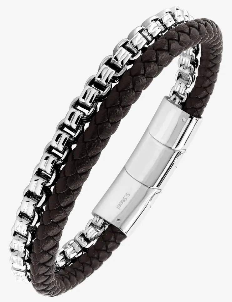 Ce bracelet en acier et matières fantaisie mesure 20 cm, ajustable jusqu’à 21,5 cm, et pèse 45,28 g. Il présente un design unique avec un cordon en chaîne et une tresse marron, offrant à la fois style et confort. Une pièce élégante et moderne qui se distingue par ses détails raffinés.
