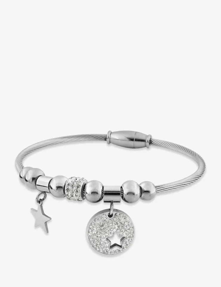 Bracelet jonc en acier orné de breloques raffinées, incluant des perles en acier et des étoiles, serties de diamants synthétiques pour une touche d’éclat. Pesant 15,50 g pour une taille de 18,5 cm et est doté d’un fermoir aimantable pour une sécurité optimale. Un accessoire chic et moderne, parfait pour rehausser votre style avec une élégance subtile.