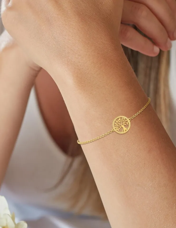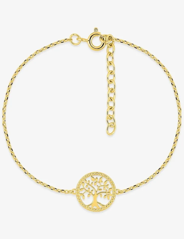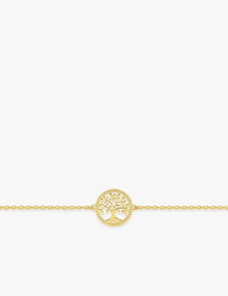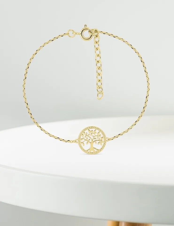 Ce bracelet en plaqué or est composé d’une chaîne forçat de 16 cm plus 3 cm de chaîne de rappel et d’un motif d’arbre de vie de 12 mm de diamètre au liseré fantaisie. Son fermoir est un anneau ressort.
