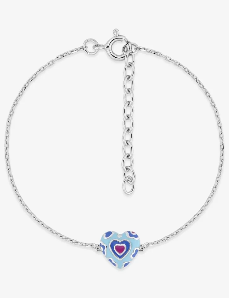 Bracelet pour enfant en argent 925 ‰ rhodié avec un pendentif cœur décoré de laque bleue et rose. Ce bijou brillant de 14 cm avec une chaine de rappel de 3 cm, s’ajuste facilement autour du poignet de l’enfant. Pesant seulement 1,62 g.,ce bracelet mignon est parfait pour compléter chaque tenue.