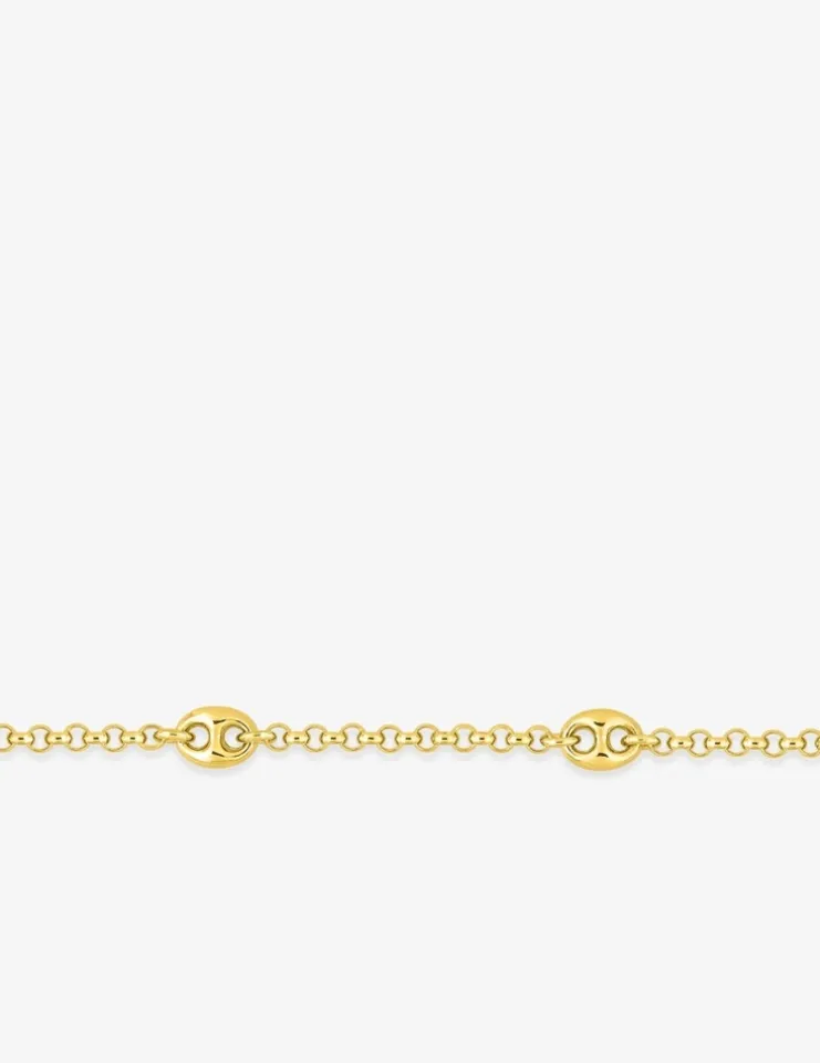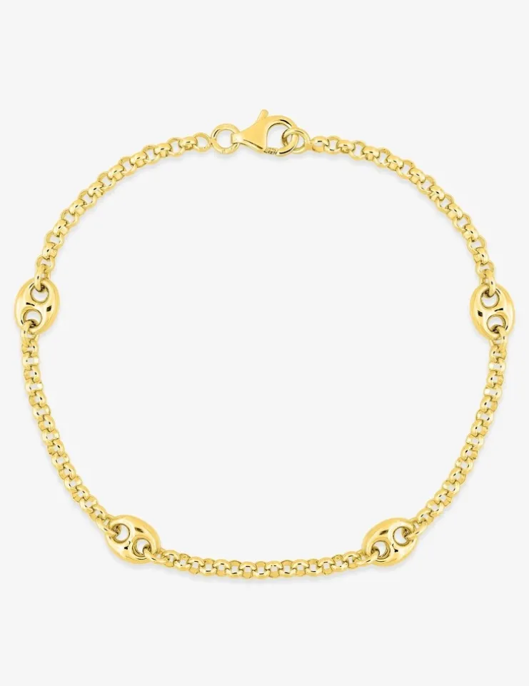 Poignet avec notre bracelet en plaqué or jaune, doté d’une chaîne souple à motifs répétitifs en maille forçat. Ce bijou unique présente quatre éléments imitant une maille en grain de café, harmonieusement répartis tout au long de la chaîne pour un effet visuel captivant. Avec un poids de 5,70 g, il allie légèreté et élégance, parfait pour un port quotidien ou pour des occasions spéciales. Sa longueur de 18 cm permet un ajustement confortable, tandis que le fermoir mousqueton assure une fermeture sécurisée. Que ce soit pour accessoiriser une tenue ou pour offrir en cadeau, ce bracelet est l’accessoire idéal pour exprimer votre style avec charme et raffinement.