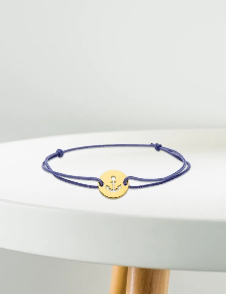 Ce bracelet cordon bleu arbore un motif ancre marine en or jaune 375 ‰ (9 carats). Ce bijou a un poids moyen d’or de 0,50 g, sa longueur est réglable.Les bracelets cordons sont particulièrement tendance,