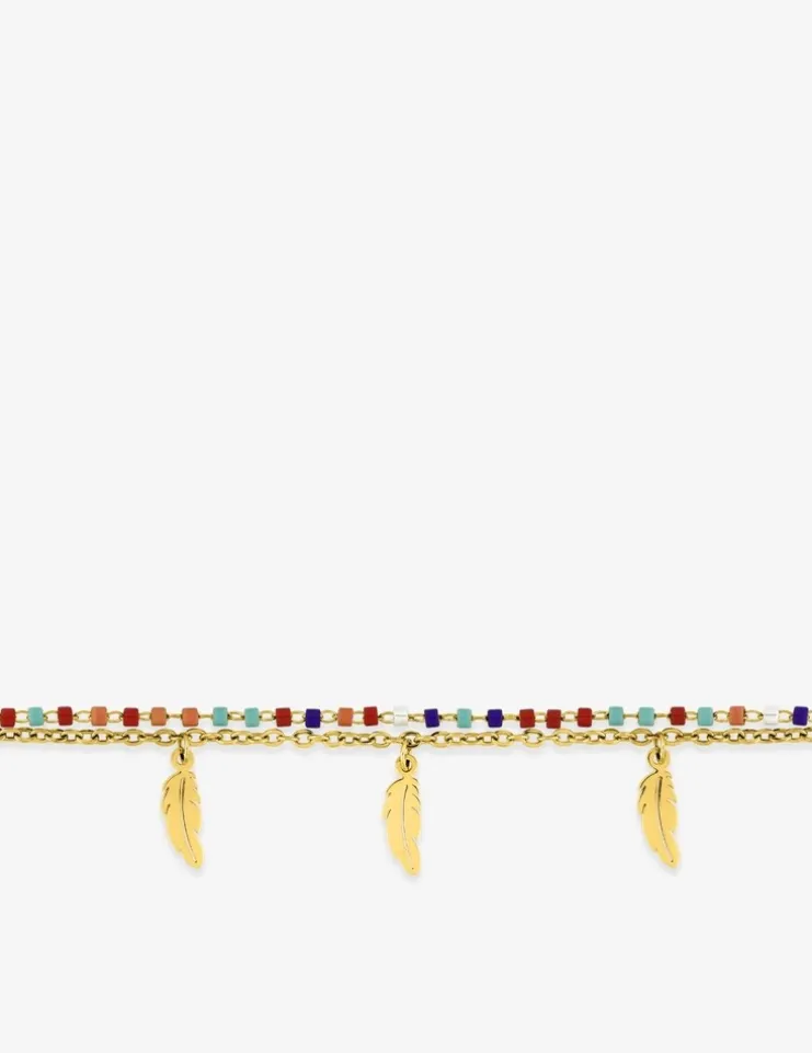 Ce bracelet, idéal pour la saison estivale, est doté d’une chaîne composée de cristaux synthétiques multicolores, et d’une chaîne en acier doré agrémentée de breloques en forme de plume de 9 mm de hauteur. Il mesure 16 cm plus 3 cm de chaîne de rappel et il se ferme avec un fermoir mousqueton.