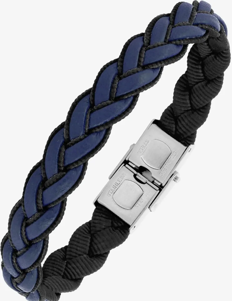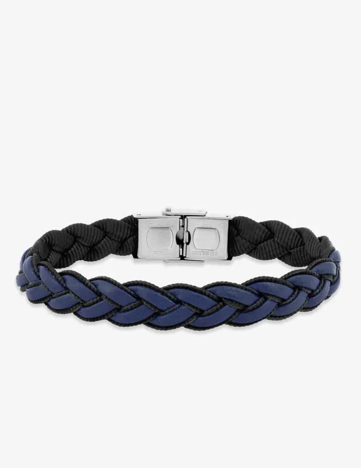 Bracelet au design torsadé qui entrelace harmonieusement un cuir bleu vibrant et un élégant cordon noir, créant un contraste saisissant rehaussé par des détails raffinés en acier gris, notamment son fermoir contemporain. D’un poids équilibré de 7,42 g, ce bijou offre une présence affirmée sans jamais être encombrant, assurant un confort optimal pour une utilisation quotidienne. L’alliance des textures du cuir souple et du cordon robuste, magnifiée par les touches métalliques de l’acier, confère à ce bracelet un caractère à la fois sportif et audacieux qui s’adaptera parfaitement à tous vos styles.