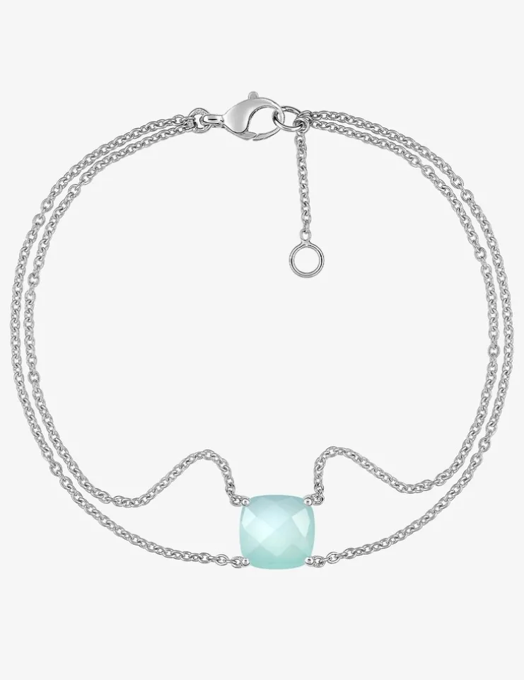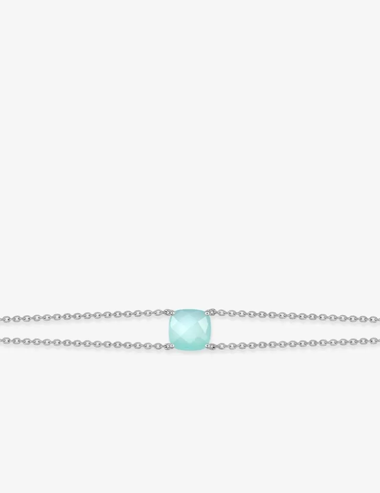Bracelet or blanc 750 ‰ (18 carats) chaine forçat double avec au centre une calcédoine bleue serti 4 griffes. Longueur 18 cm ajustable, et fermoir mousqueton.Le poids moyen d’or pour ce bracelet est de 2,25 g.