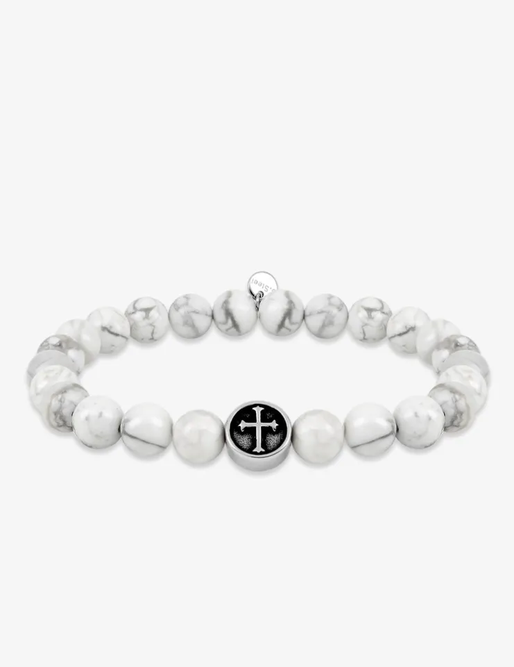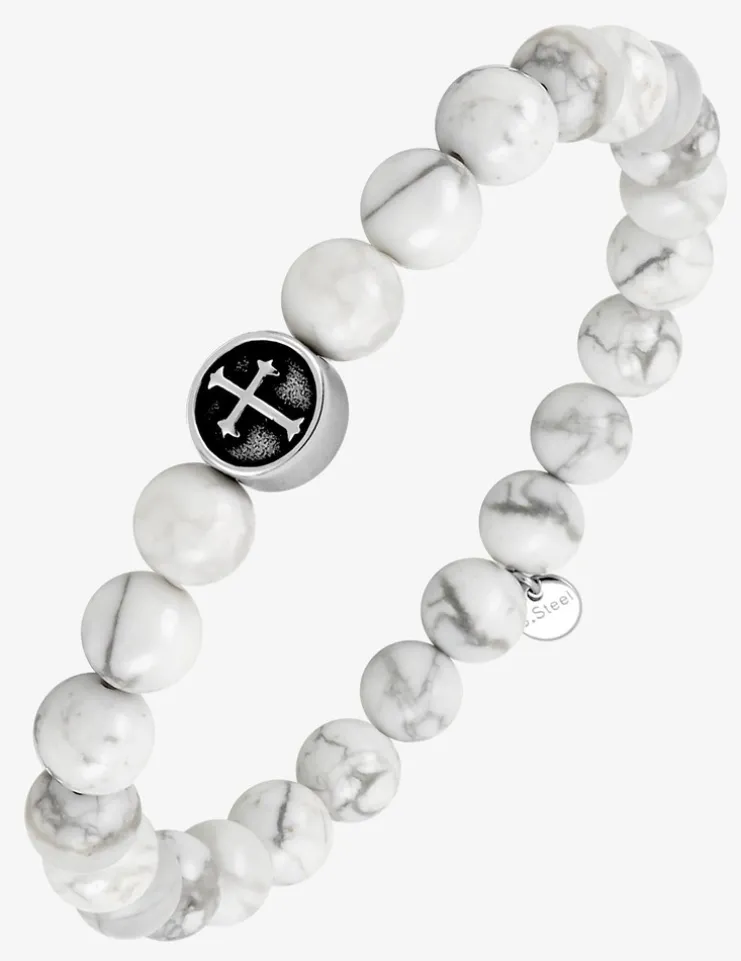 Ce bracelet pour homme se compose de perles d’agate blanche de 8 mm de diamètre et d’une breloque en acier dotée d’un motif de croix. Élastique, ce bracelet s’adaptera à tous les poignets.