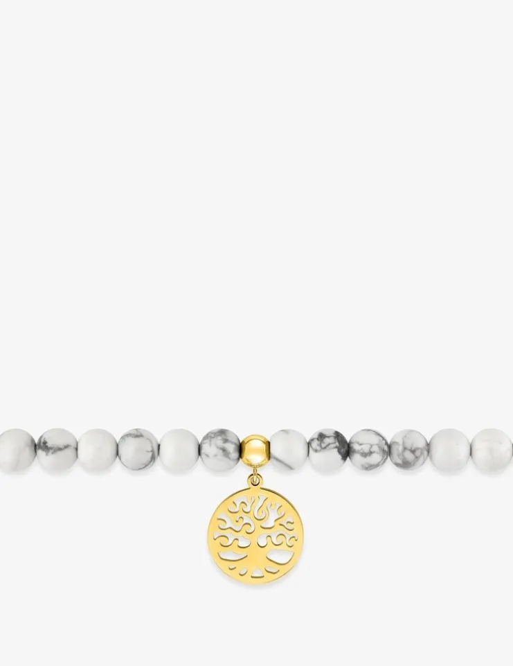 Sublimez votre poignet avec ce joli bracelet élastique. Il se compose de turquoises blanches de 6 mm de diamètre, et d’une breloque en acier doré de 13 mm de diamètre qui représente un arbre de vie.