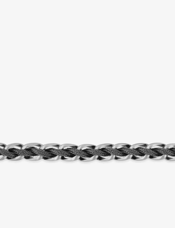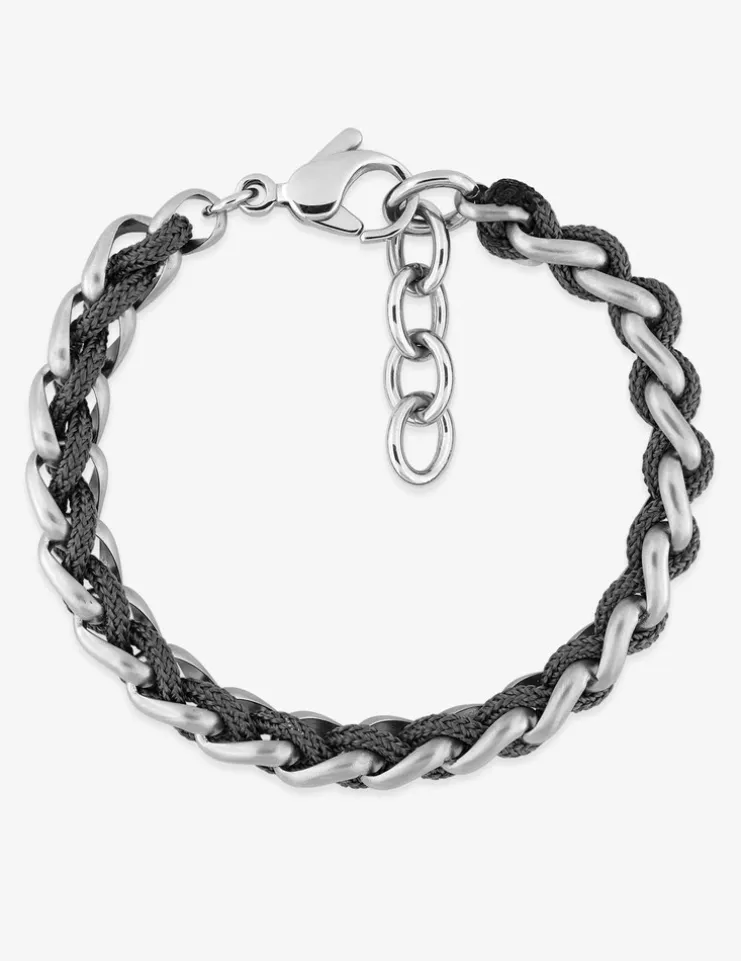 Bracelet en acier, agrémenté d’un cordon noir torsadé à travers la chaîne pour un design unique et captivant. Mesurant 19 cm de longueur avec une extension de 3 cm pour une flexibilité optimale, ce bijou original et robuste affiche un poids total de 13,00 g. Il se ferme en toute sécurité grâce à un fermoir mousqueton, garantissant une tenue fiable.
