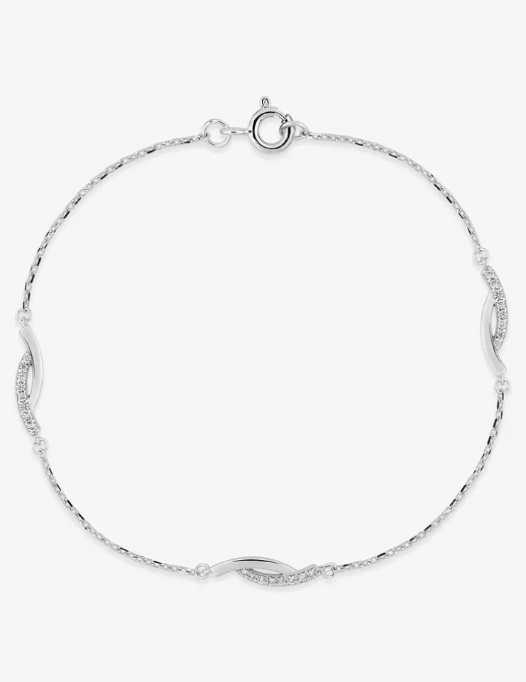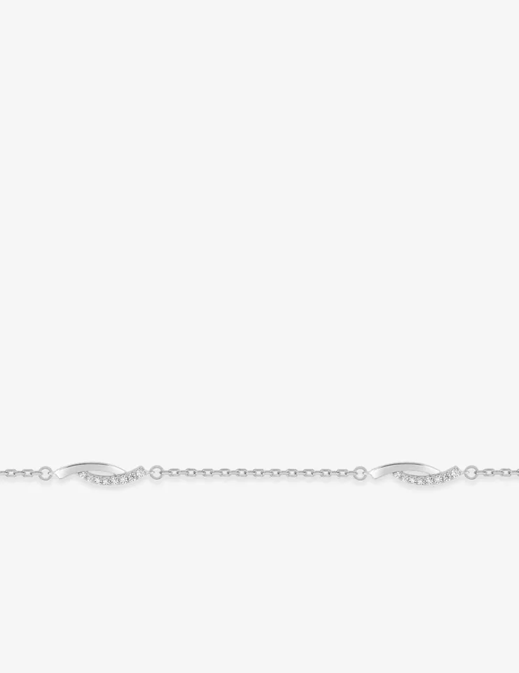 Bracelet en argent 925‰ rhodié, agrémenté de trois motifs arrondis ornés d’oxydes de zirconium blancs. Avec un poids de 1,41 g et une longueur totale de 18 cm, ce bijou se ferme facilement grâce à un fermoir à anneau ressort. Idéal pour apporter une touche d’élégance discrète à votre style quotidien.