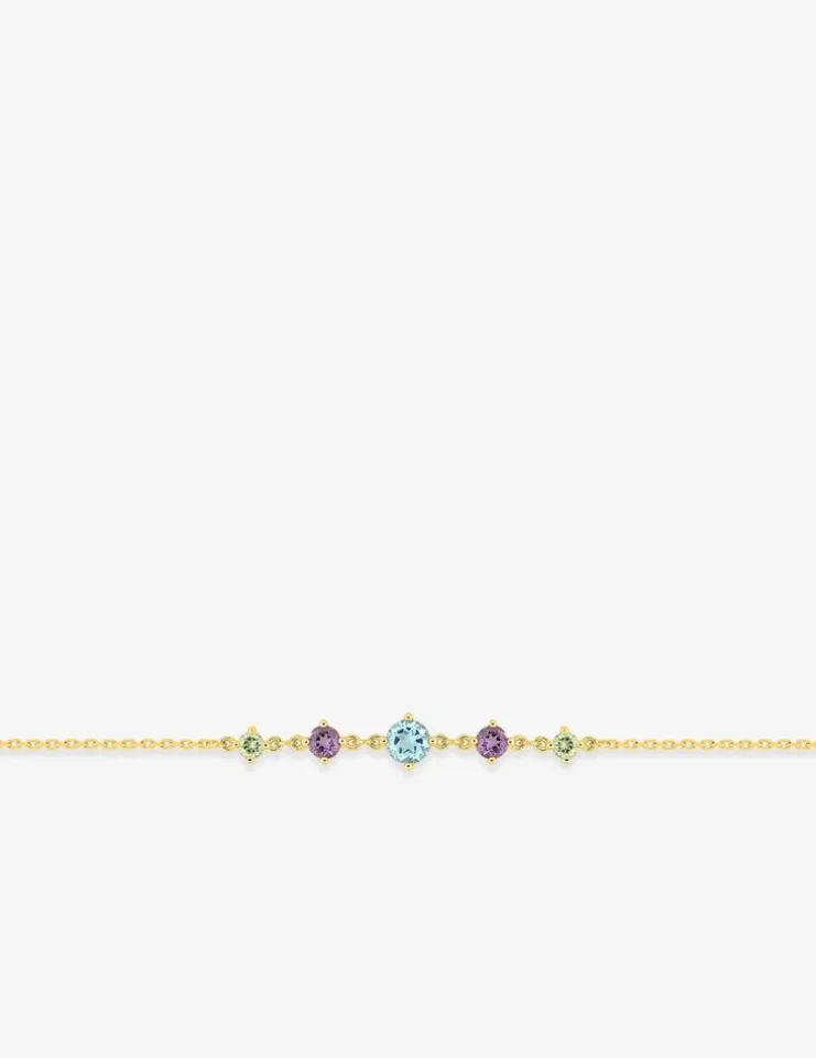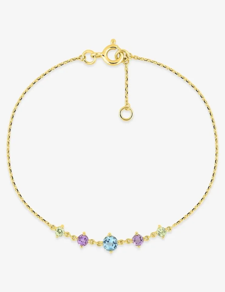 Bracelet en or jaune 750 ‰ (18 carats), mettant en valeur trois types de pierres : topaze bleue, améthyste et péridot, pour un éclat riche en couleur. Mesurant 18 cm de longueur, ajustable à 16,5 cm grâce à un anneau intermédiaire, ce bijou affiche un poids d’or moyen de 1,85 g. Il se ferme en toute sécurité avec un fermoir à anneau ressort. Un bracelet lumineux et élégant, parfait pour ajouter une touche d’élégance à votre poignet.