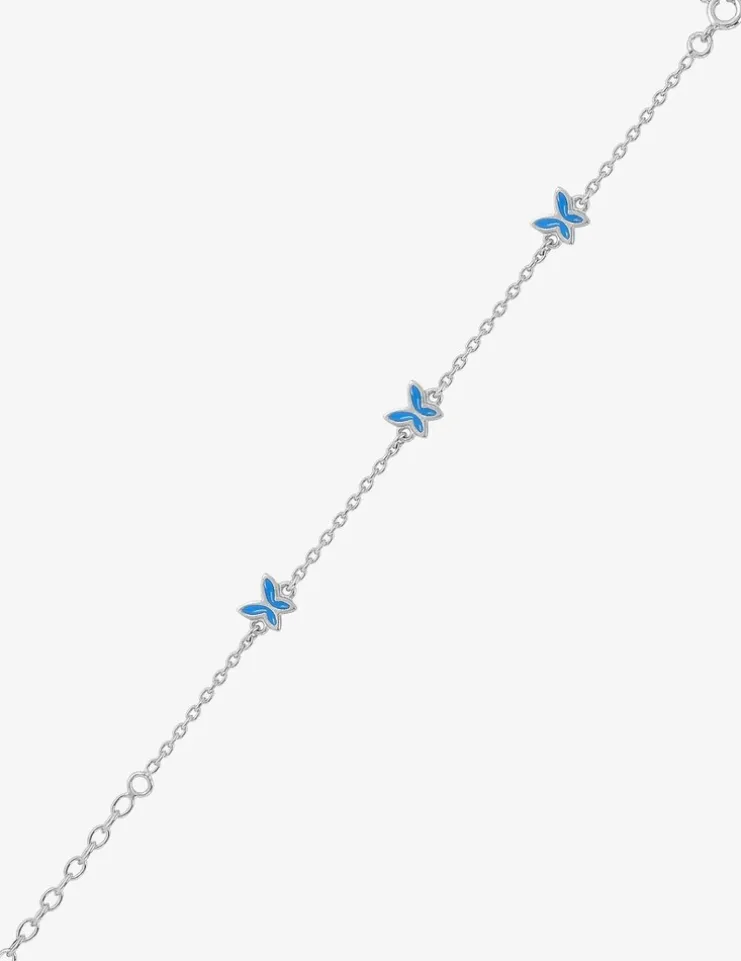 Bracelet pour enfant en argent rhodié 925 ‰, un bijou qui saura séduire les plus jeunes. Il est orné de trois adorables papillons, délicatement laqués en bleu pour apporter une touche de couleur et de fantaisie au modèle. Mesurant 14 cm et doté d’une extension de 3 cm, ce bracelet s’ajuste parfaitement aux poignets des enfants, assurant un confort optimal. Avec un poids total de 2,45 g, il est léger et agréable à porter.