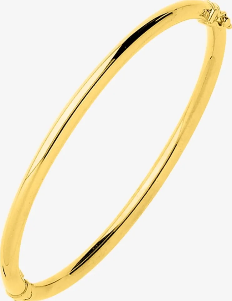Ce bracelet jonc ouvrant est fait d’un fil rond de 4 mm d’épaisseur en or jaune 375‰ (9 carats) et d’un fermoir embout avec huit de sécurité. Il mesure 50 mm par 60 mm pour un poids d’or de 4,75 g.