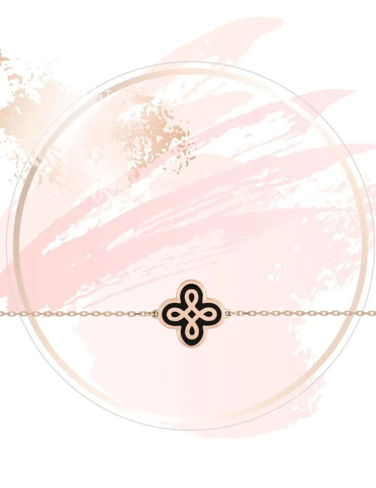 Bracelet » Lore » en or rose 375‰ et laque de couleur noir de Jais de la collection Lorever. Une fine chaîne ornée d’un motif simple et délicat, évoquant le symbole de l’infini, de l’amour éternel.Le poids d’or moyen de ce bracelet est de 1,20 g.