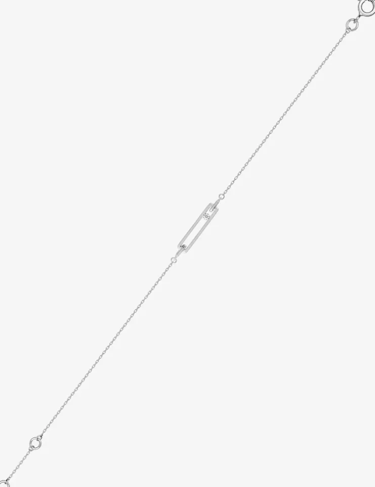 Bracelet or blanc 375‰ (9 carats) composé d’une chaine maille forçat orné d’un maillon rectangle contenant un oxyde de zirconium. Ce bijou a un poids moyen d’or de 0,95 g pour une longueur de 18 cm. Il est équipé d’un anneau intermédiaire à 16,5 cm et d’un fermoir à anneau ressort.Ce bracelet au design épuré en or et oxyde de zirconium se veut résolument moderne et raffiné.