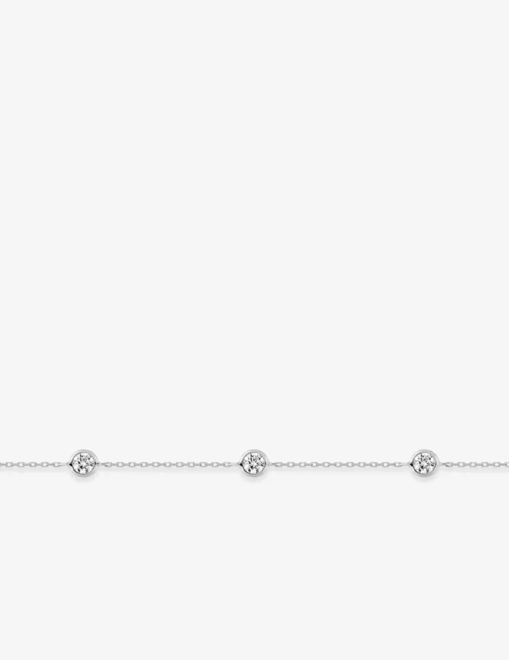 Bracelet en or blanc 750 ‰ (18 carats) et oxyde de zirconium. Il se compose d’une chaîne forçat et 5 motifs ronds qui contiennent un oxyde de zirconium serti clos. La chaîne mesure 18 cm avec un anneau intermédiaire à 16,5 cm et un fermoir anneau ressort. Le poids moyen en or est de 1,00 g.