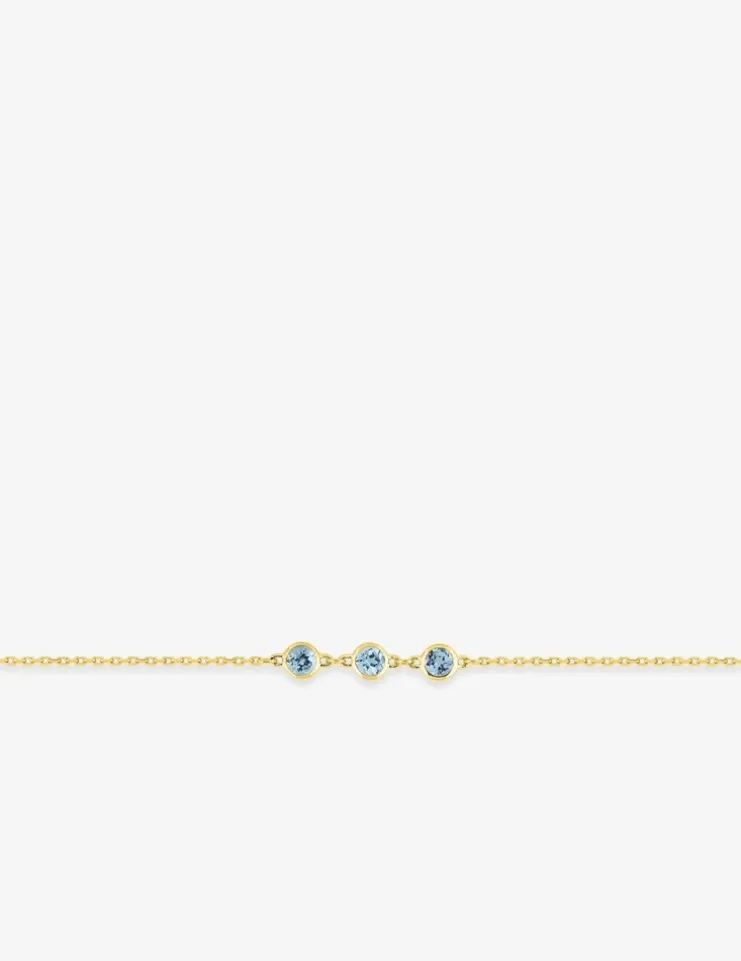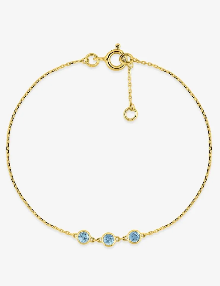 Ce joli bracelet en or jaune 375‰ (9 carats) est rehaussé par trois topazes bleues traitées au serti clos. Il mesure 18 cm avec un anneau intermédiaire à 16,5 cm pour un poids d’or de 0,80 g, et son fermoir est un anneau ressort.