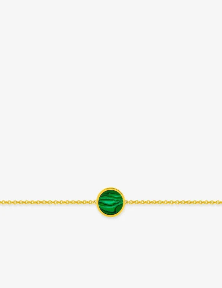 Bracelet or jaune 750 ‰ (18 carats) chaine forçat avec au centre une malachite sertie clos de forme ovale. Longueur 18 cm ajustable, et fermoir mousqueton.Le poids moyen d’or pour ce bracelet est de 2,20 g.