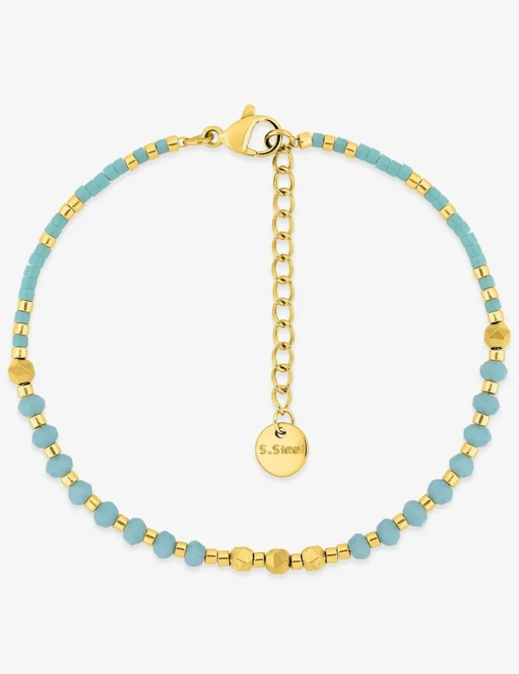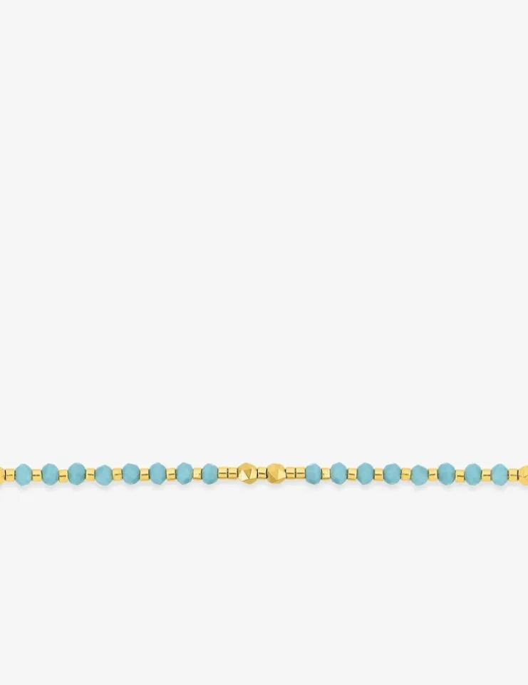 Optez pour ce bracelet en acier doré. Doté de boules en verre turquoises et d’hématites, il mesure 16 cm de longueur et possède une chaîne de rappel de 3 cm. Il se ferme grâce à un fermoir mousqueton. Il est l’accessoire tendance et coloré à avoir pour la belle saison.