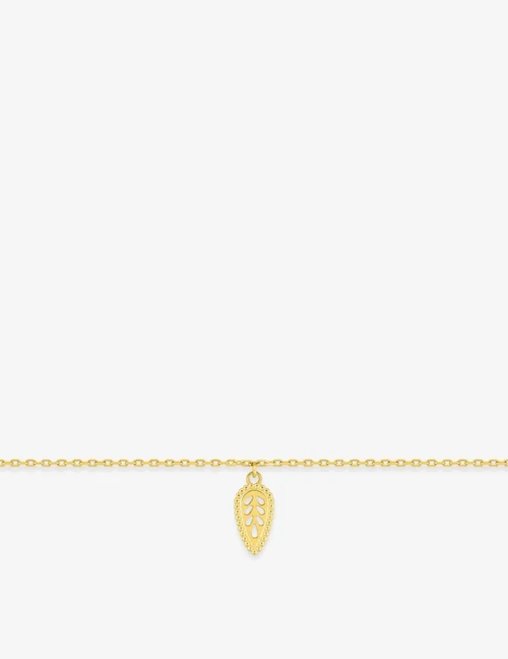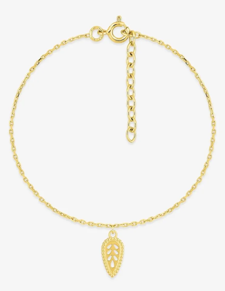 Ce joli bracelet est composé d’une chaîne forçat et d’un motif pendant feuille et goutte ajourée, il mesure 19 cm dont 3 cm de chaîne de rappel et un fermoir en anneau ressort.