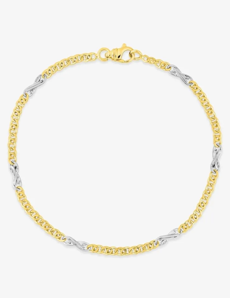 Cette chaîne en or 750‰ (18 carats) possède une maille fantaisie en or jaune et or blanc de 3 mm de largeur. Elle pèse 3,70 g pour 18 cm (bracelet) et 8,75 g pour 45 cm (collier). Le fermoir est un mousqueton.