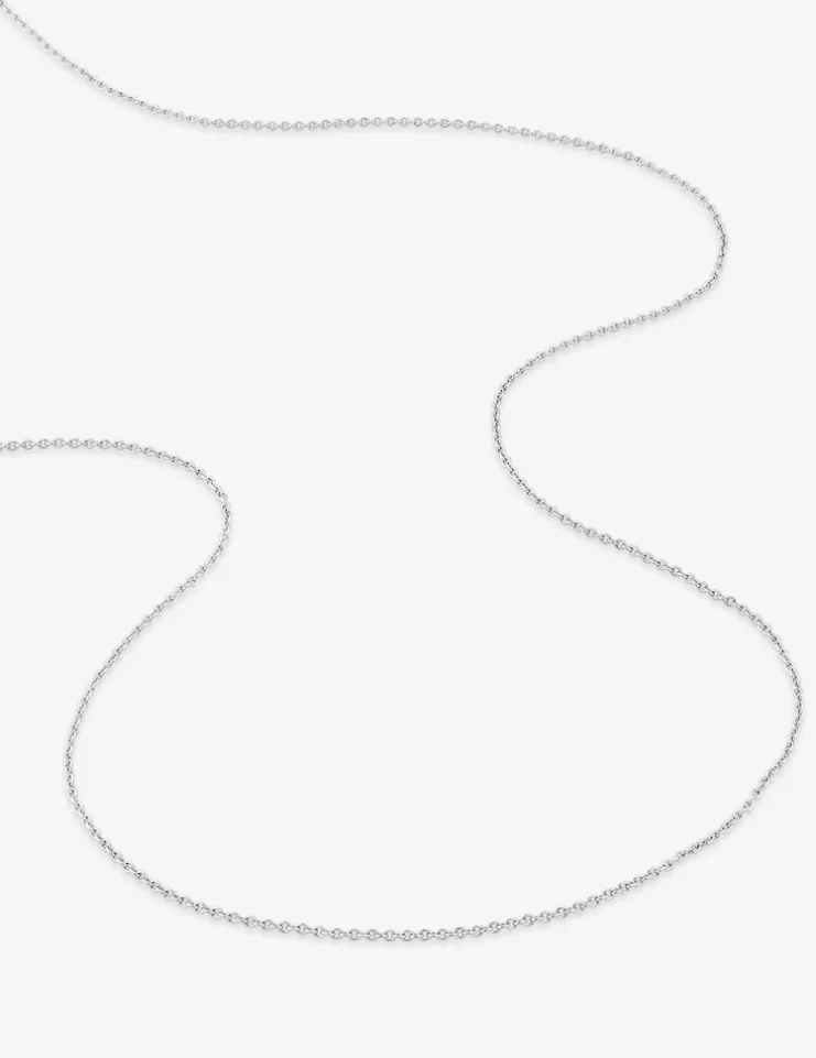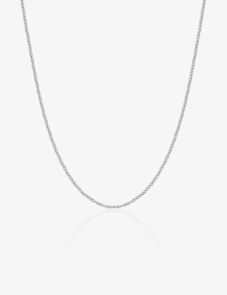 Chaine en or blanc 750 ‰ (18 carats). Cette chaine en maille forçat ronde a un poids moyen d’or de 1,80 g pour une longueur de 40 cm et une largeur de 1,10 mm et elle est équipée d’un fermoir anneau ressort.