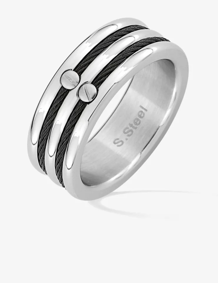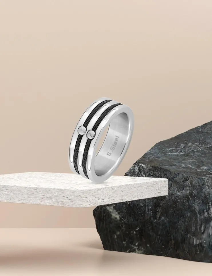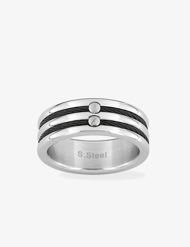 Cette chevalière en acier est sublimée par deux câbles noirs fermés par des vis. Elle mesure 6 mm de largeur.