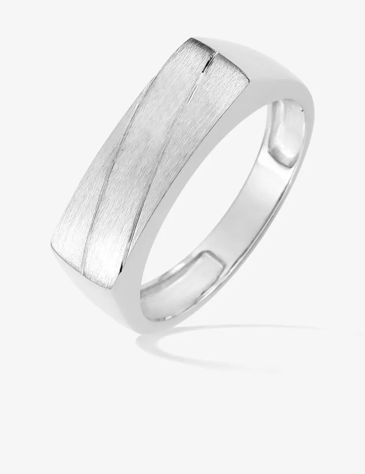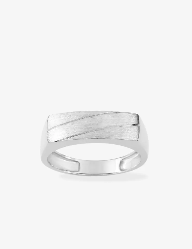 Cette chevalière en argent rhodié 925 ‰ au plateau brossé est sublimée par deux rainures. Son poids est de 4,10 g et le plateau mesure 20 mm de largeur pour 6 mm de hauteur.