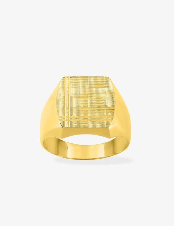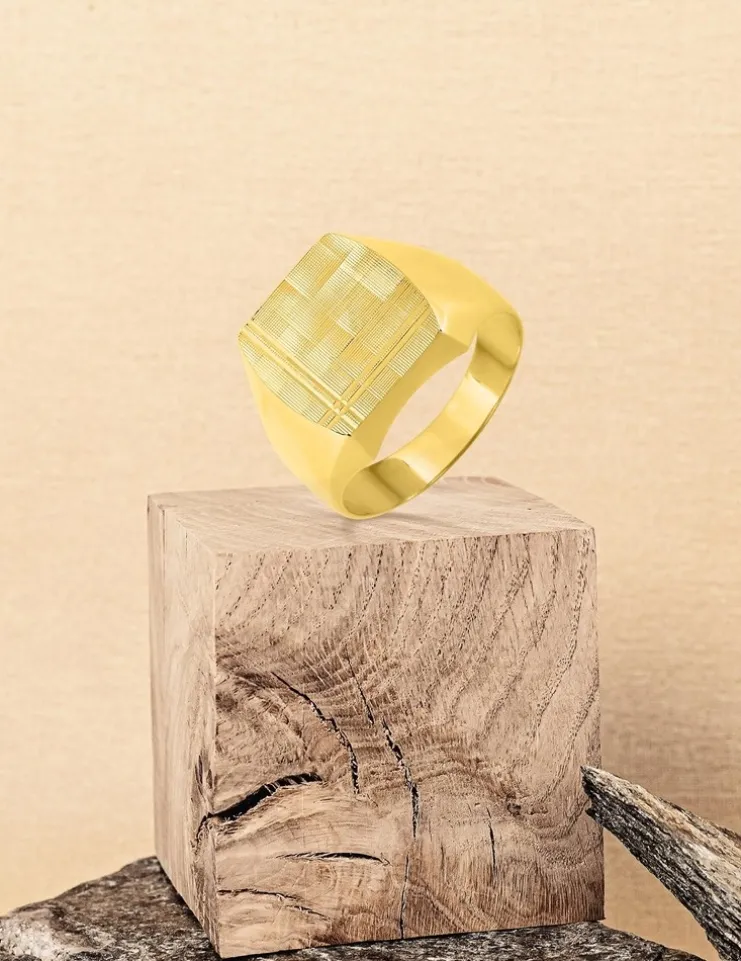 Chevalière or jaune 375 ‰ (9 carats). Le plateau de cette chevalière est de 10×12 mm, avec un motif cadrillage diamanté et rainuré. Son poids d’or théorique est de 4,90 g. Cette chevalière est creuse et sa monture est polie. On ne se lassera pas de ce type de bijoux original !