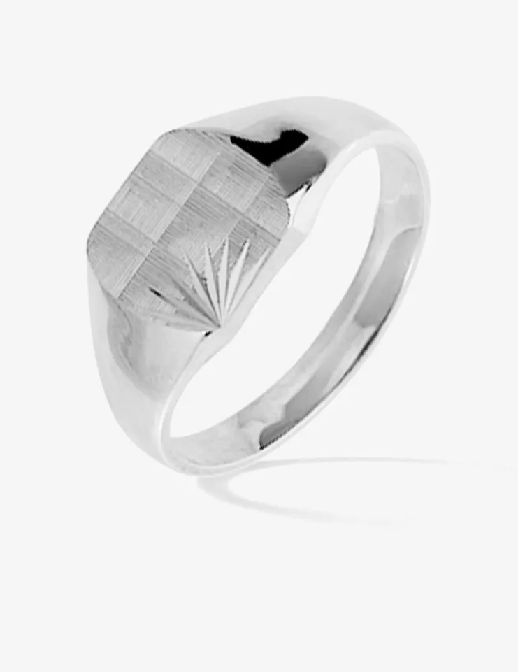 Cette chevalière en argent 925‰ rhodié possède un plateau rectangle de 10 mm par 8 mm sublimé par un quadrillage et des ciselures fantaisie dans le coin inférieur gauche.