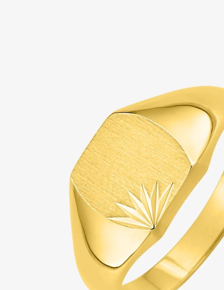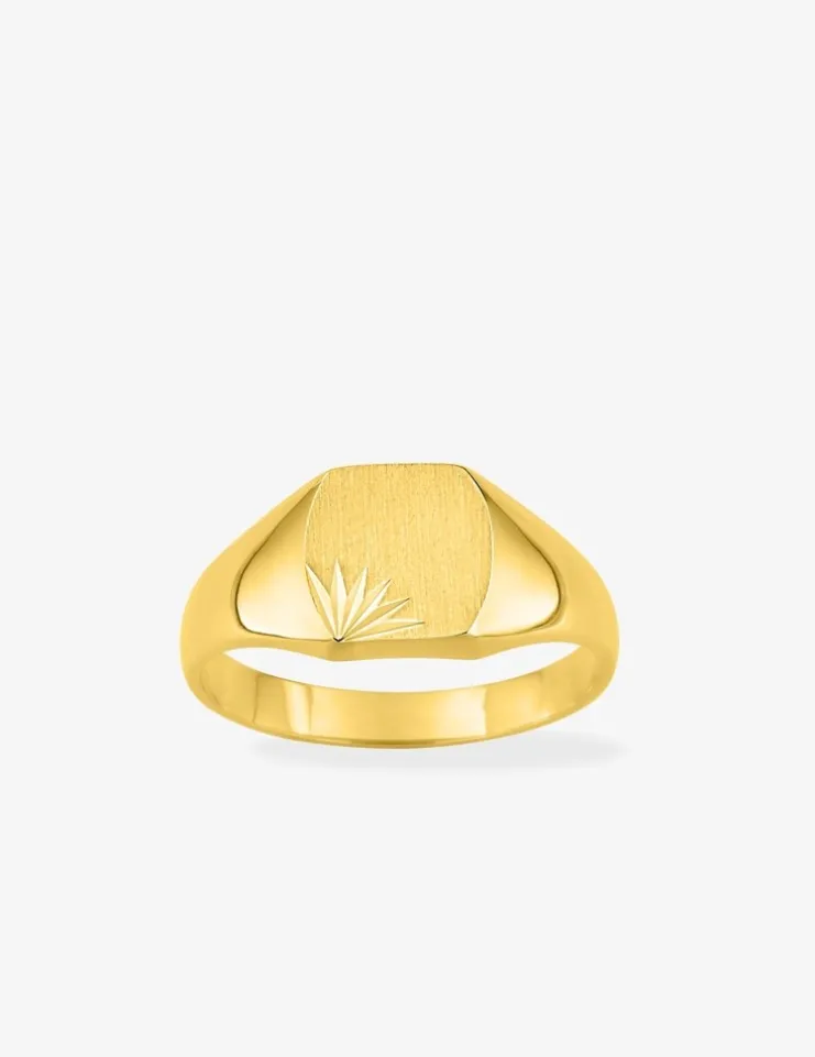 Chevalière or jaune 750 ‰ (18 carats). Cette chevalière possède un plateau carré 9×9 mm, avec une finition brossée, ponctué d’un motif à l’esprit feuillage. Elle a un poids théorique d’or de 6,60 g. Cette chevalière à l’allure massive est sobre et élégante.