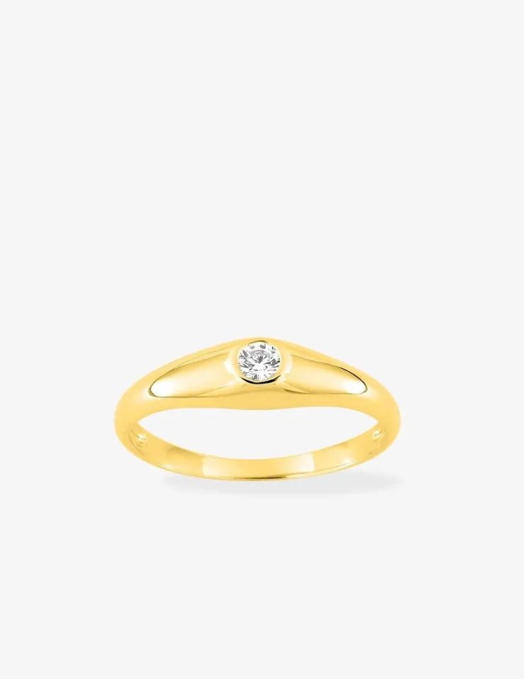 Chevalière or jaune 750 ‰ (18 carats). Cette chevalière possède au centre un oxyde de zirconium de 0,10 ct en serti clos sur le dessus bombé. Son poids or théorique est de 1,90 g. Ce modèle de bague ancienne porte le nom de « Jonc Anglais », un classique de la bijouterie, intemporel et indémodable.