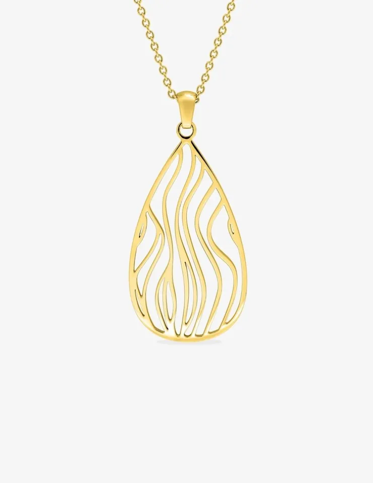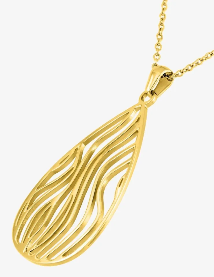 Collier en acier doré, agrémenté d’un pendentif en forme de goutte avec un motif graphique de 42×22 mm, suspendu à une bélière de 7 mm. La fine chaîne forçat de 45 cm et son poids léger de 4,99 g en font un bijou idéal pour un port quotidien. Ajoutez une touche de sophistication et de magie à votre style avec cet accessoire incontournable, qui rehaussera chacune de vos tenues.