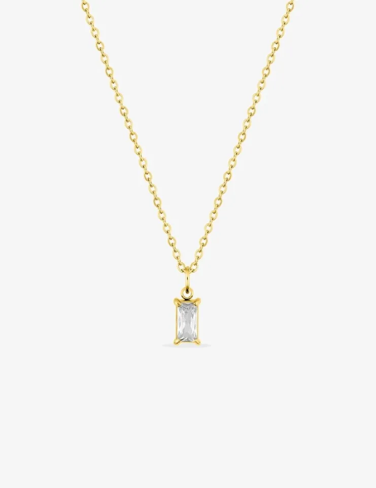 Ce délicat collier en acier doré est doté d’un pendentif serti d’un oxyde de zirconium blanc. De forme rectangle, il mesure 6 mm par 3 mm. La chaîne a une longueur de 40 cm plus 5 cm de chaîne de rappel. Un collier discret qui s’accordera avec tous vos looks !